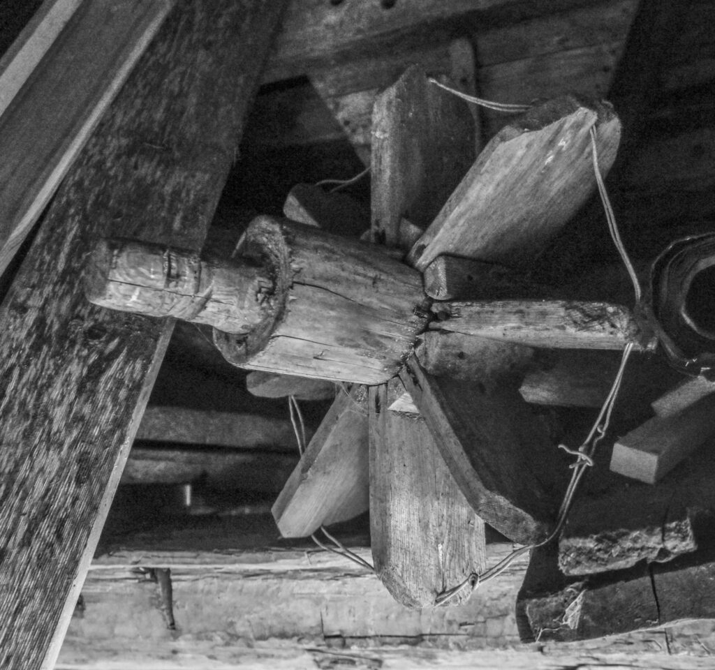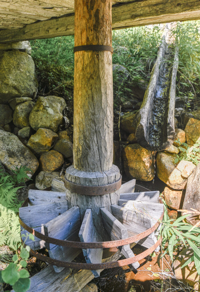 Vassrenna og kvernkallen under kvernhuset. Når vatnet treff fjørene på kallen blir kvernkallen drive rundt. Foto: Geir Daasvatn