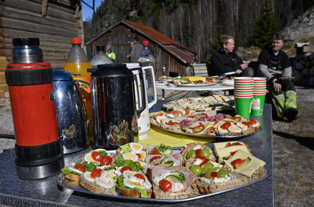 Alle vellukka prosjekt har ein «koordinator». På Skore er det bror til Olav, Torstein Øygarden, som har teke på seg oppgåva. Under byggemøtet 7. april hadde han med kona Marianne Eikrem Øygarden som støttespelar og ansvarleg for serveringstilbodet. Eit lykkeleg val! Smørbrøda forsvann frå fata fortare enn morgonsola kunne fordrive doggen frå graset.